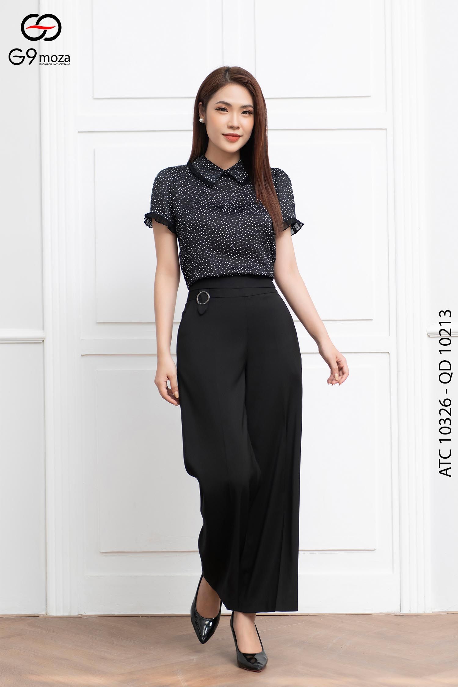 Quần palazzo là item được những cô nàng công sở rất ưa chuộng trong mùa hè bởi sự rộng rãi, bay bổng. Khi kết hợp cùng áo sơ mi chấm bi điệu đà sẽ mang tới sự thanh lịch và nữ tính đến không ngờ.