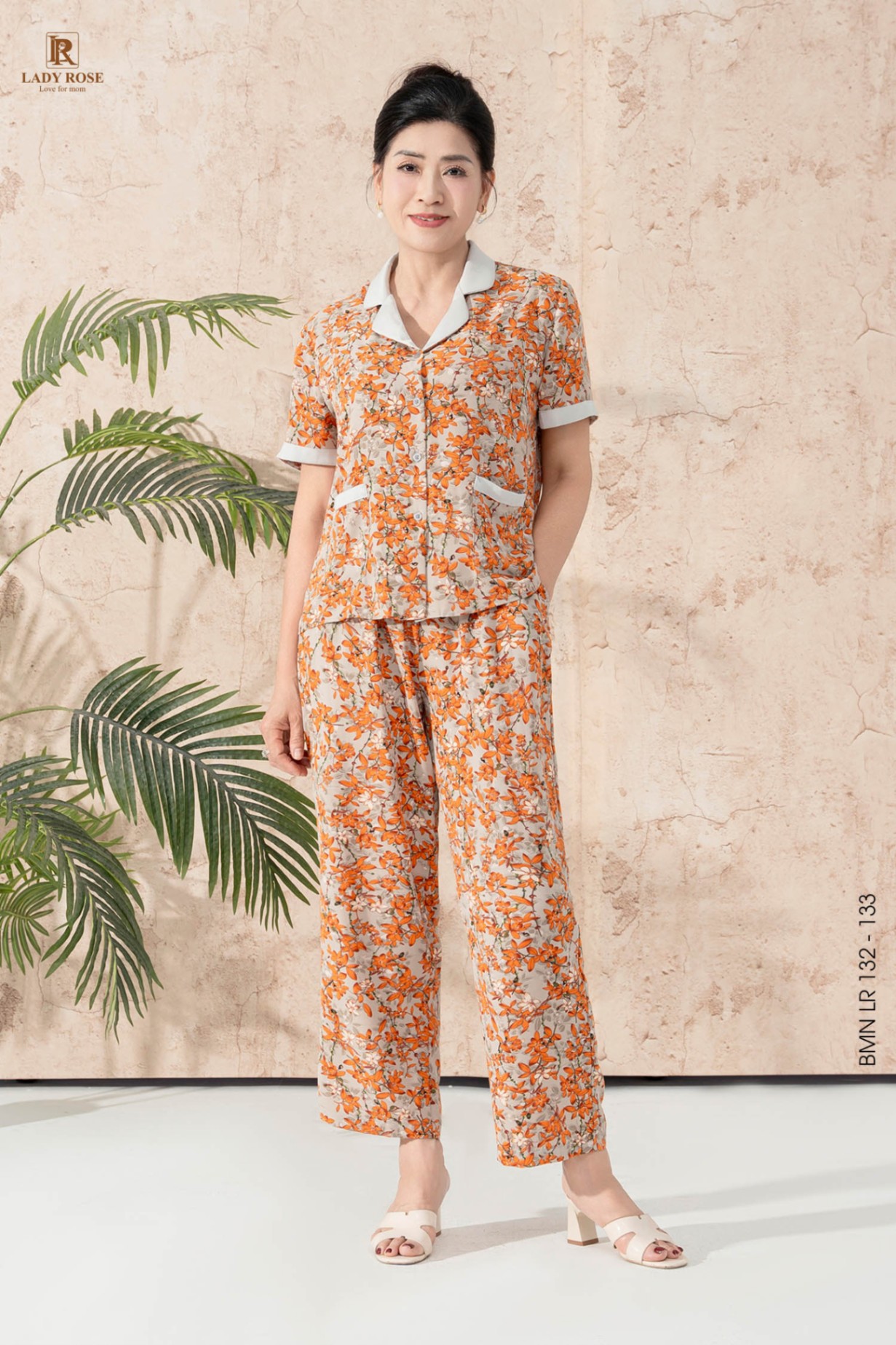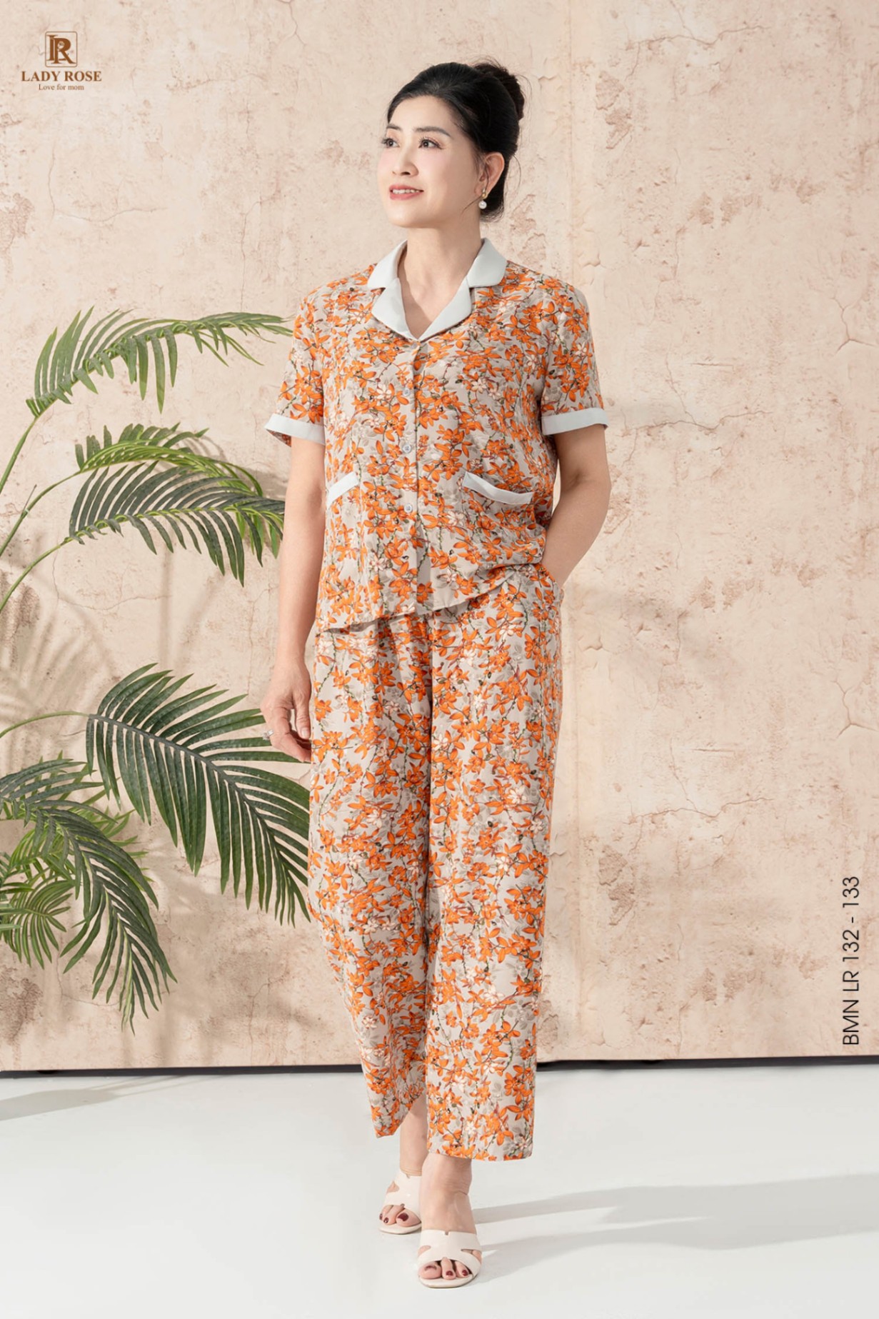 Bộ mặc nhà áo tay cộc quần dài chất liệu lụa hàn 25S17BMNLR132+133-2