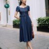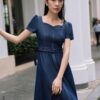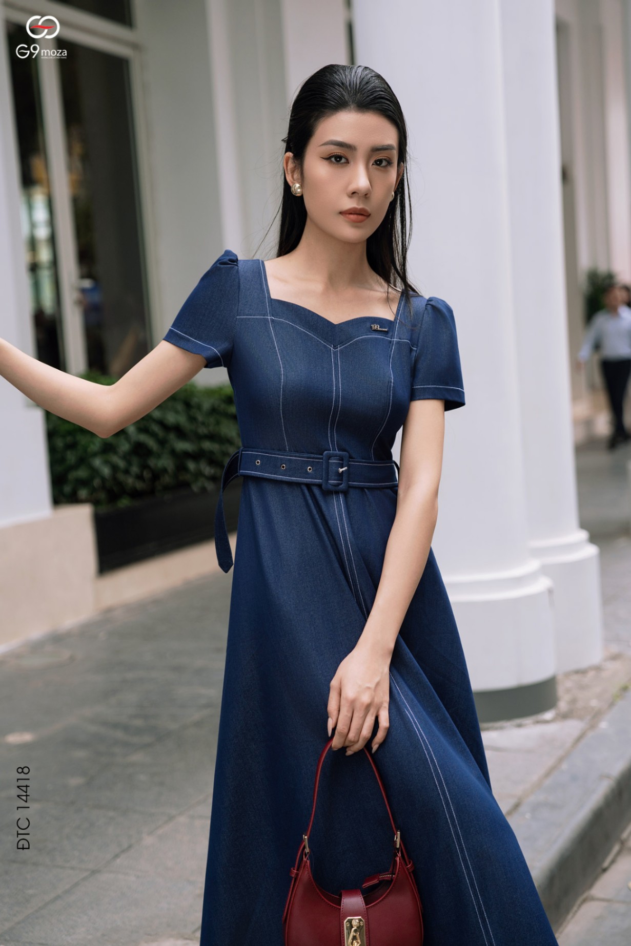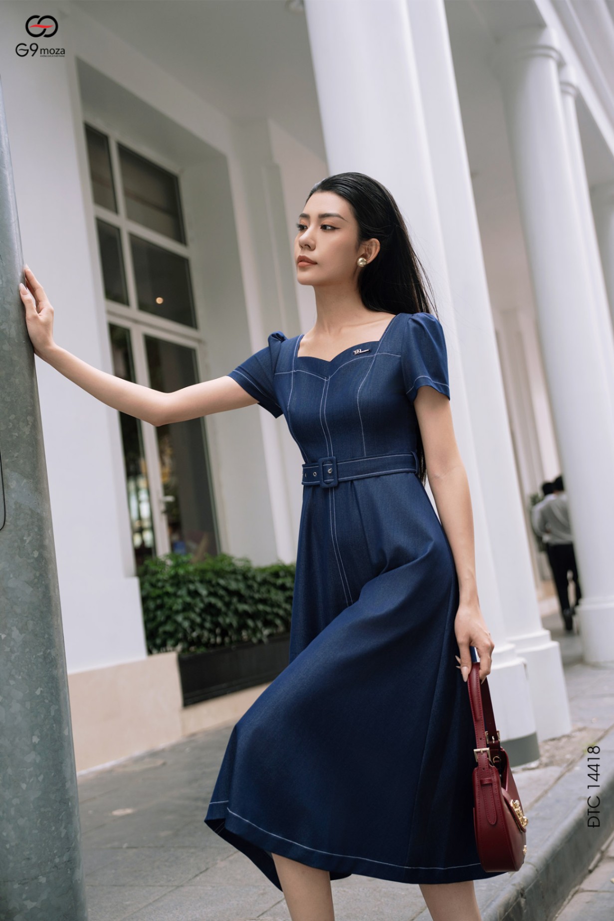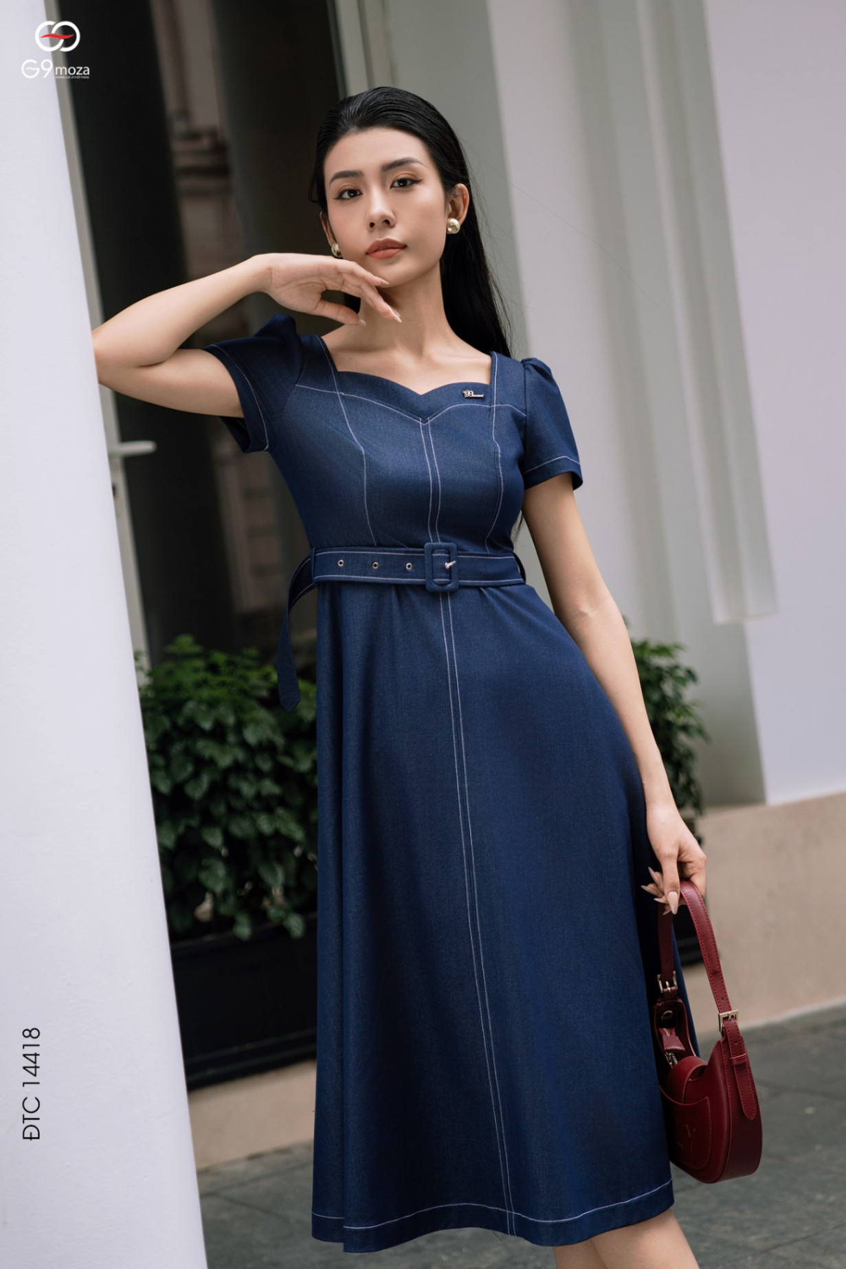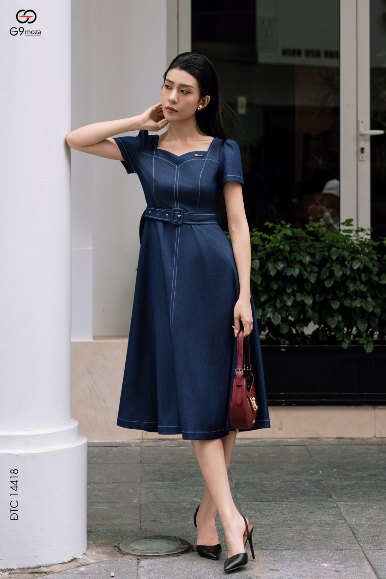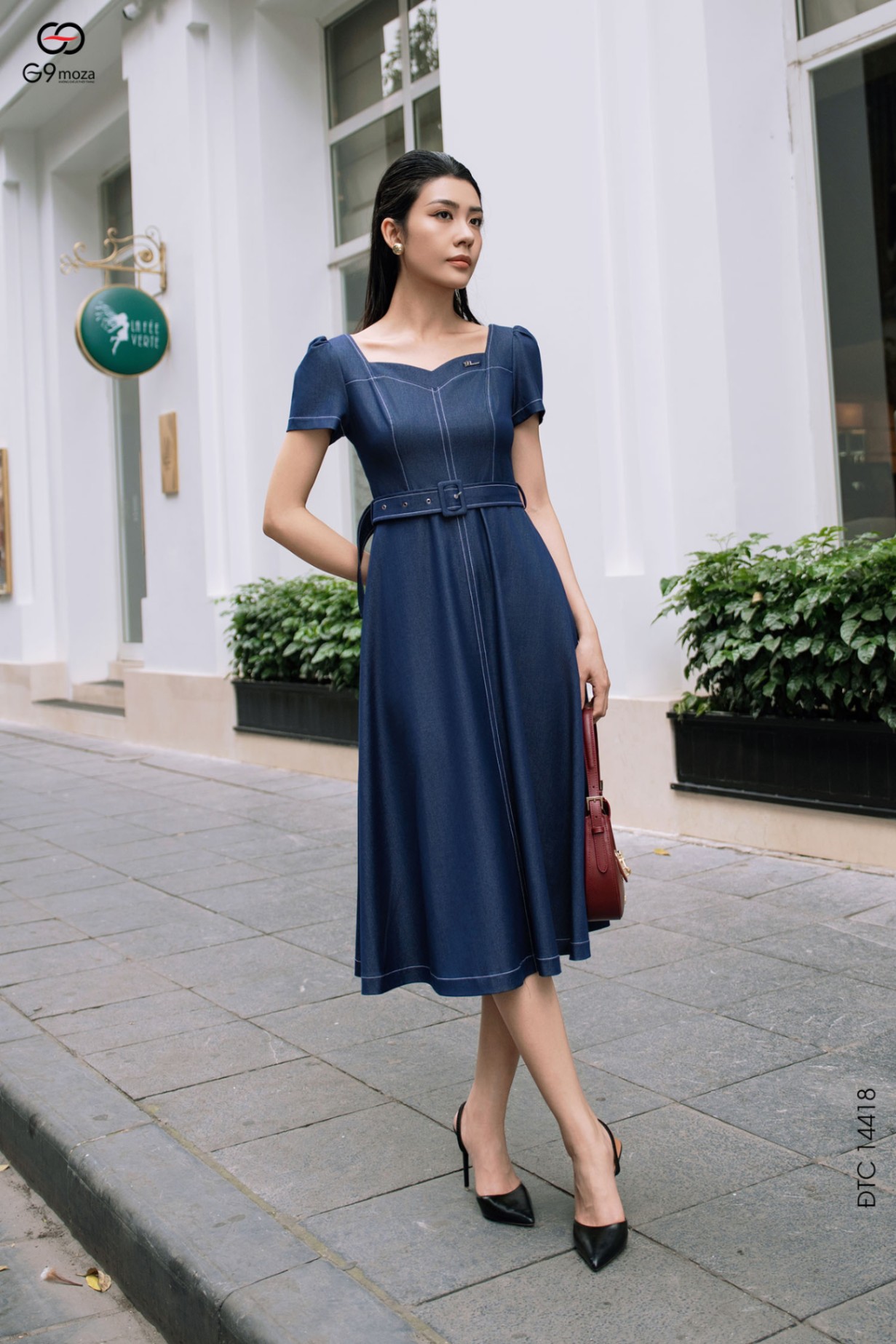 Đầm denim tay cộc dáng xòe kèm đai 25S16ĐTCX14418-1