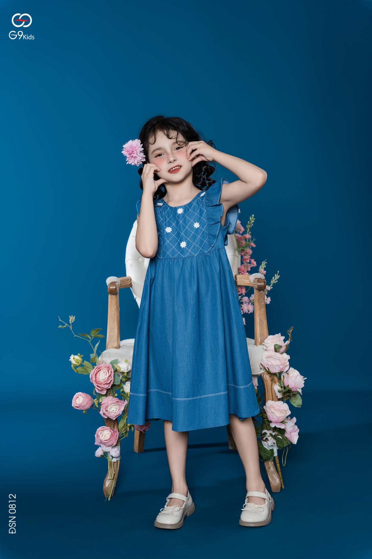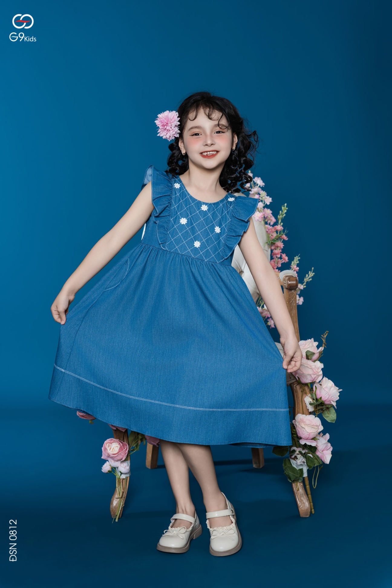 Váy liền sát nách phối bèo chất liệu jeans lụa 25S57BĐSN0812-1