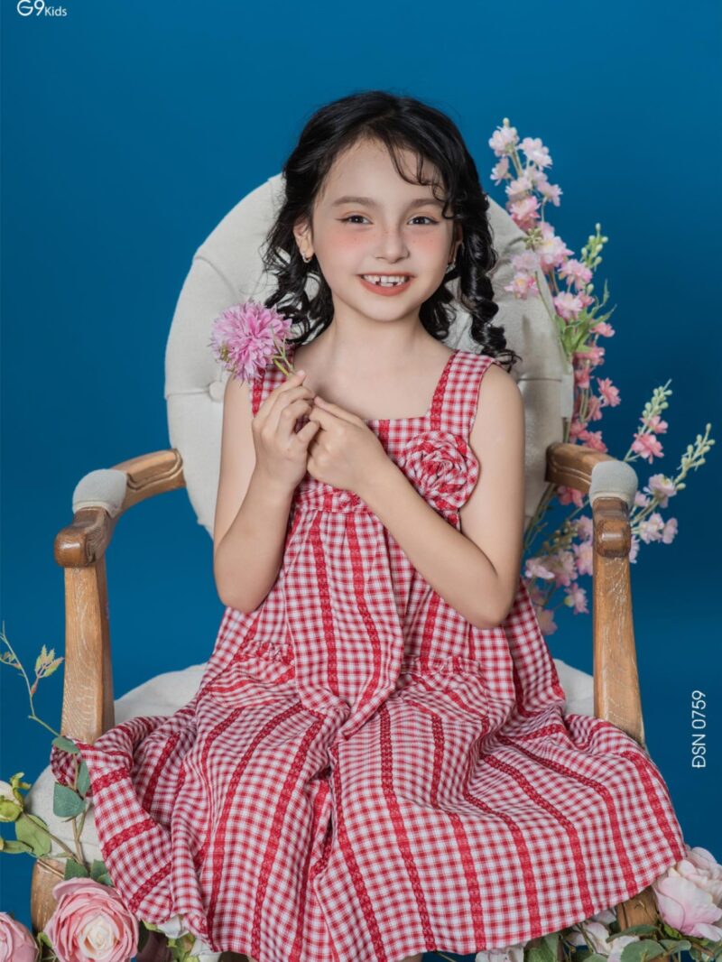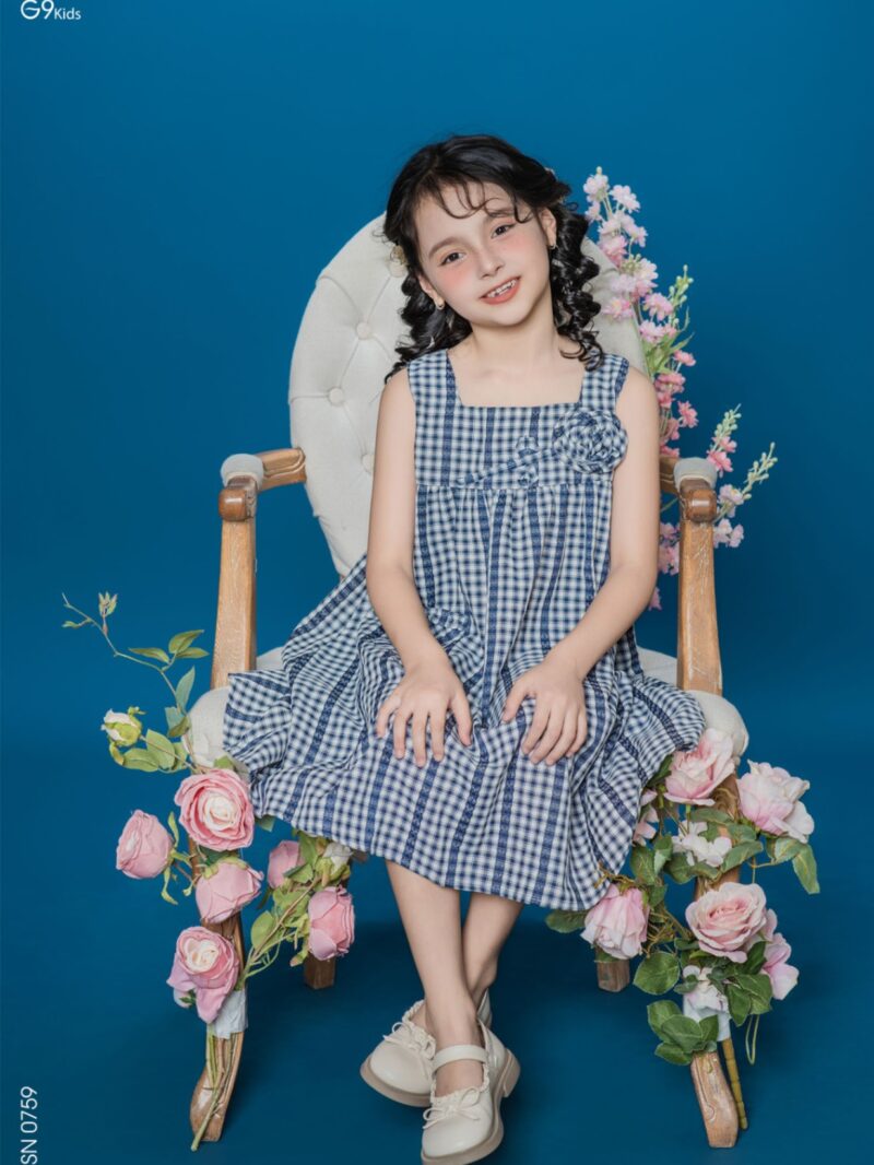 Váy sát nách chất liệu thô kẻ phối hoa 3D cho bé gái 25S57BĐSN0759-2